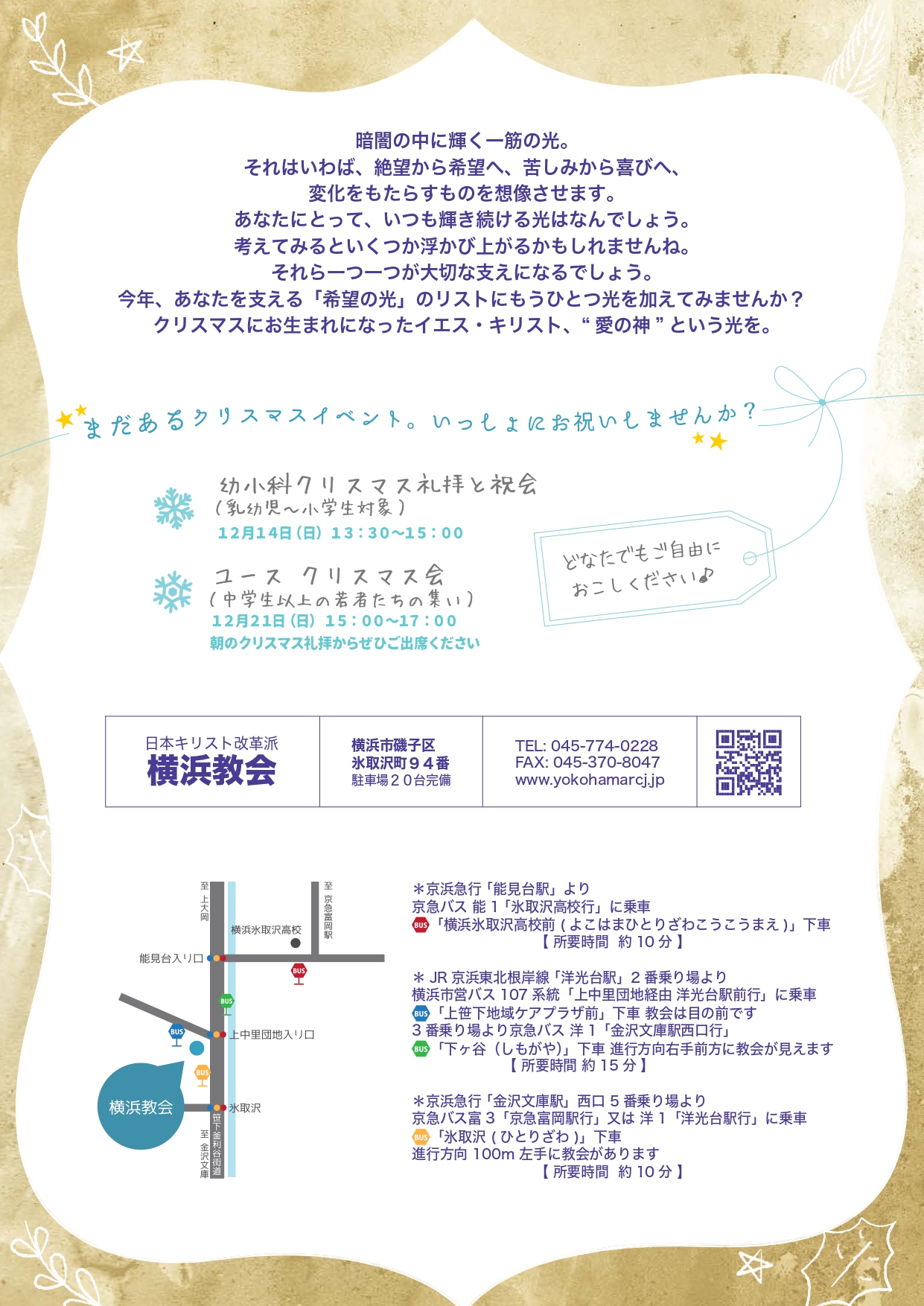 毎週行われているのと同じ形式の礼拝の中で、初めての方にも分かりやすいキリスト教のクリスマスのお話を聞きます。