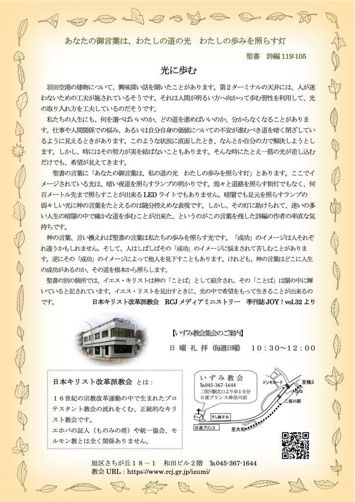【いずみ教会】秋のオープンチャーチのご案内 掲載日:2025年09月25日 横浜教会と関係深い、旭区二俣川にあるいずみ教会の集会案内です。 <所在地> 旭区さちが丘18-1 和田ビル2階 ℡045-367-1644 教会URL:https://www.rcj.gr.jp/izumi/ 相鉄線 二俣川駅下車 お近くにお住まい方、キリスト教に関心がある方、キリスト教主義学校へ通う方など皆様の来会を心より歓迎します。 この記事に添付ファイルはありません