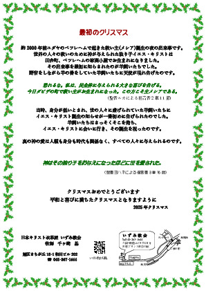 いずみ教会 クリスマス 掲載日:2025年12月01日 相鉄線二俣川にあり、横浜教会と親しい関係にあるいずみ教会のクリスマスのお知らせです。 二俣川のお近くにお住まいの方がいましたら是非、お越しください。心から歓迎致します。 いずみ教会ホームページは こちらをクリック https://www.rcj.gr.jp/izumi/ ↓この記事には添付ファイルがあります↓ 2025クリスマスチラシ表.pdf 2025クリスマスチラシ裏.pdf